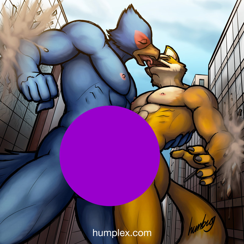 Commissioned piece. The Star Fox team, Falco and Fox in giant form, and tiny Wolf stuck between them, hehe. :D